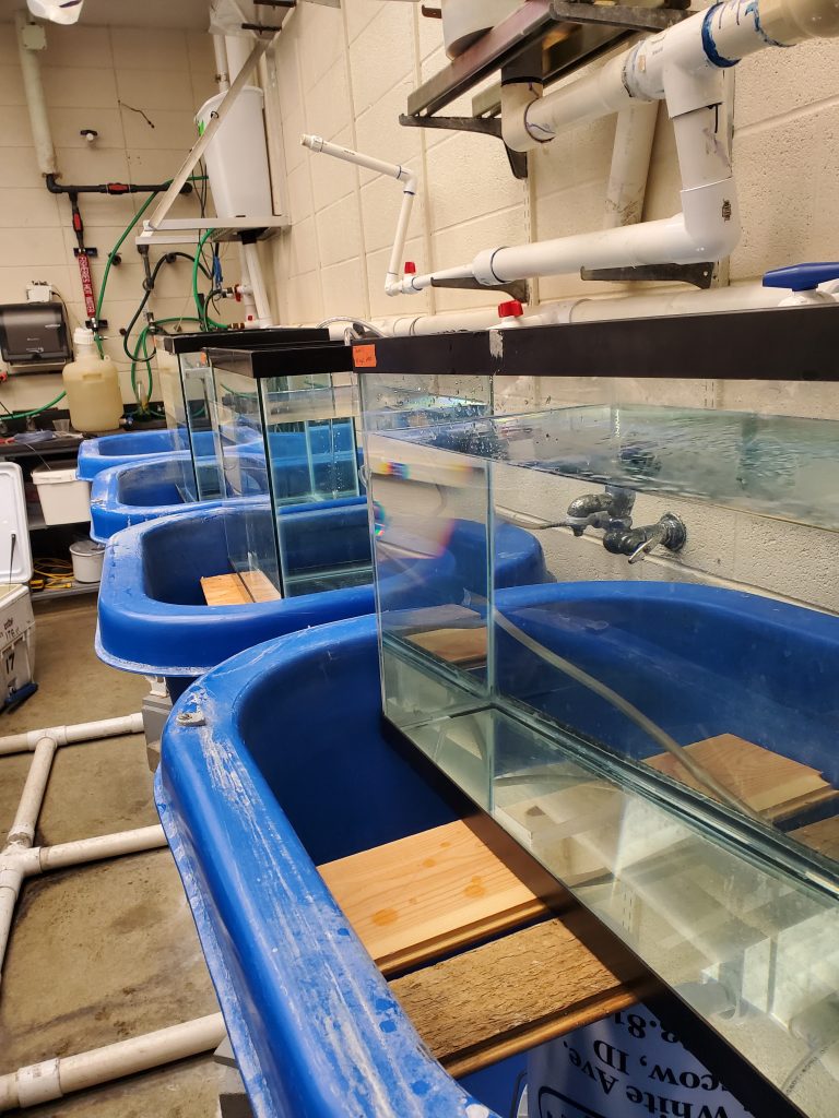 For the experiments, the team filled up five tanks with sixty liters of water each. Each tank was dosed with different amounts of 6PPD-Q: the first with 0 ng/L (since it was the control tank), the second with 5 ng/L, the third with 25 ng/L, the fourth with 95 ng/L, and the fifth with 250 ng/L. After letting the 6PPD-Q mix with the water in the tanks for an hour, the team put six signal crayfish in each tank. Over three days, two crayfish and water samples were taken from each tank every 24 hours, along with water quality data from the YSI. After the three days, the team dissected the crayfish and put the tissues in sample bottles to be processed for 6PPD0-Q.