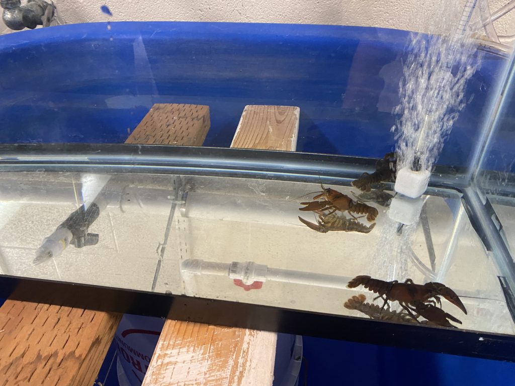 To make sure they caught enough rusty crayfish for the experiments, the team went to Magone Lake near John Day, OR. Characterized by a reddish-brown color and striking, rust-colored spots on their backs, rusty crayfish are extremely invasive; they’ll eat anything they can get their claws on, which can have huge impacts on the ecosystems they are invading (i.e. Magone Lake). This lake is overrun with rusty crayfish, so the team had no trouble catching more than enough for the experiments.
